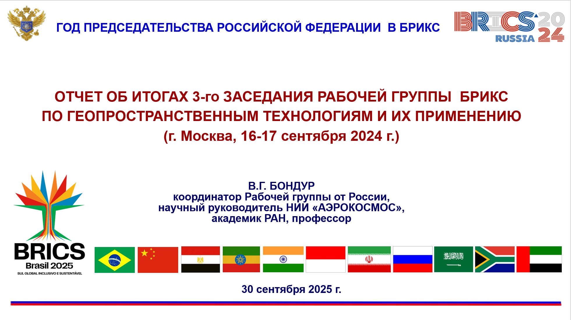 Координатор Рабочей группы от России, научный руководитель НИИ «АЭРОКОСМОС» академик РАН В.Г.Бондур выступил с докладом, содержащим отчет о 3-й встрече Рабочей группы БРИКС по геопространственным технологиям и их применению, которая состоялась в сентябре 2024 г. в России в год председательства Российской Федерации в БРИКС.