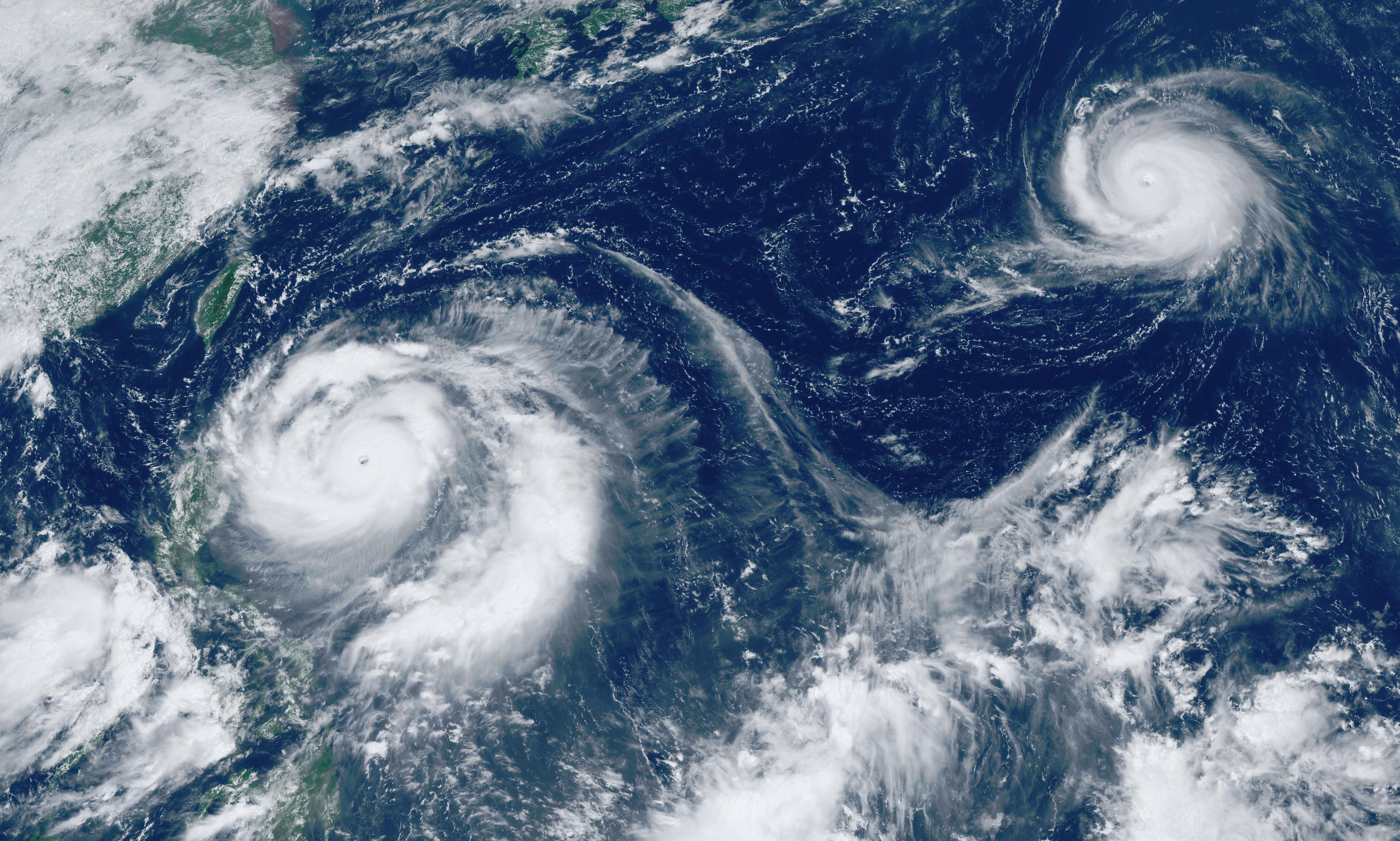 Космическое изображение тайфунов «Рагаса» (слева) и «Неогири» (справа), полученное 21 сентября 2025 г. со спутника HIMAVARY-9